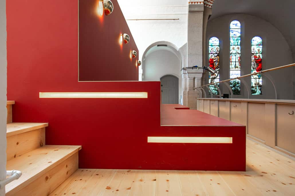 Vi har udført 3 flotte siddemøbler med indbygget skabe, lys og strøm. Alle 3 møbler er forskellige og tilpasset hver enkelt pulpitur. Møblerne er beklædt med flot rød linoleum, og alle kanter og hjørner er udført i messing, speciallavet af gørtiler.